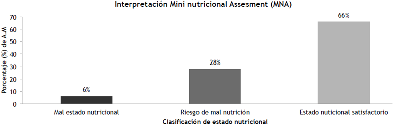 Mini nutricional Assesment (MNA) de Guigoz, et al., (1997) adaptación de Barrera, Castillo, Martin, Torrado, Cifuentes y Rodríguez (2008): Es un instrumento útil, rápido, fácil y fiable (sensibilidad del 96% y especificidad del 98%) que permite evaluar el estado nutricional y de salud del adulto mayor. La MNA asigna el sujeto a una categoría nutricional según el puntaje recibido en sus 4 componentes: Mediciones antropométricas, evaluación global del estilo de vida, (incluida la medicación y la autonomía), hábitos dietéticos y alimentarios, y autopercepción de la salud y el estado nutricional (Cuyac & Santana, 2007).