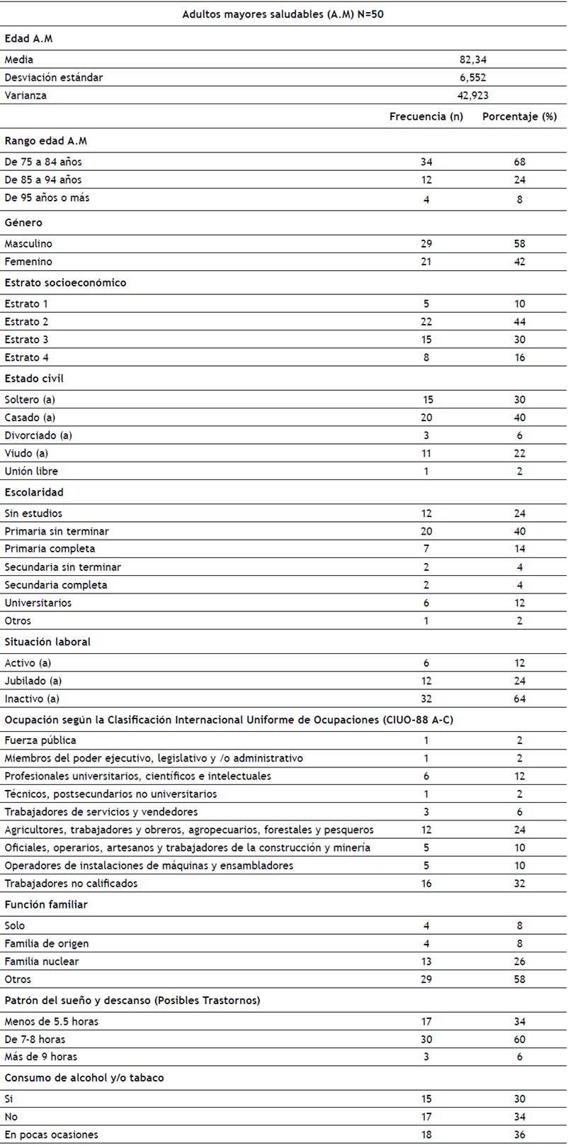 Tabla 1 Datos sociodemográficos y variables personales de una muestra de adultos mayores sanos de Santander.