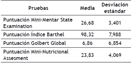 En la Tabla 2 se evidencian las puntuaciones promedio con sus respectivas desviaciones estándar de las pruebas de estado cognitivo, funcionalidad física, salud mental y estado nutricional.