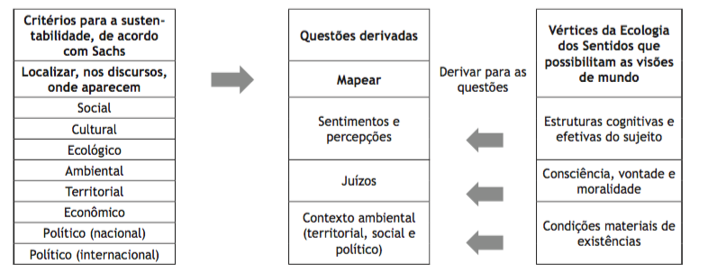 Adotamos, portanto, a Ecologia dos Sentidos (Campos, 2015a, 2015b, 2017; Campos e Grabovschi, 2011) por ser uma teoria que integra meio ambiente e sociedade em processos de desenvolvimento ecológico, e as oito dimensões da sustentabilidade, segundo Sachs (2002). Suas imbricações orientaram a análise dos dados que recolhemos para responder às questões de pesquisa.