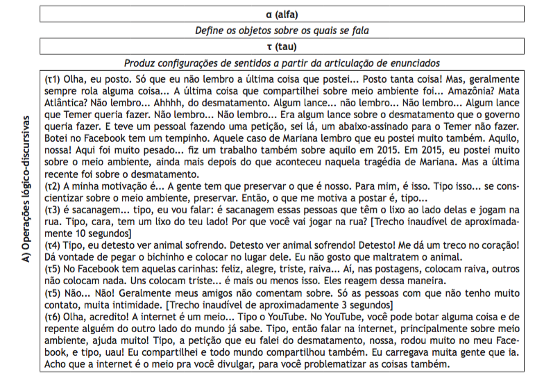 Aplicamos aos discursos selecionados a análise lógico-natural. Explicar esse procedimento ultrapassa os objetivos deste artigo. Em resumo, a lógica natural foi desenvolvida pelo semiólogo, comunicólogo e lógico suíço Jean-Blaise Grize com o objetivo, entre outros, de fornecer uma ferramenta rigorosa de análise do discurso cotidiano. Ela permite a extração de representações — entendidas aqui como “imagens do mundo” — e a interpretação das configurações de sentidos por meio da identificação de objetos e operações que constituem os discursos, levando em conta o caráter intersubjetivo da comunicação (Grize, 1996, 1997). As letras gregas que aparecem no primeiro quadro da Figura 2 exemplificam as diferentes operações dessa metodologia de análise discursiva (Campos, 2015a, 2015b, 2017; Campos e Grabovschi, 2011).