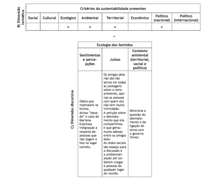 Após a análise e interpretação lógico-natural do discurso, buscamos (1) categorizar suas unidades de acordo com os critérios de sustentabilidade de Sachs (2002) e (2) com três vértices da Ecologia dos Sentidos: as estruturas cognitivas e afetivas do sujeito; a consciência, a vontade e a moralidade, e as condições materiais de existência.