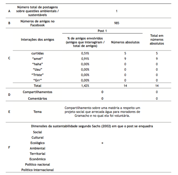 Finalmente, fizemos a análise da linha do tempo do Facebook (ver exemplo de aplicação na Figura 3). Levamos em consideração o número total de postagens sobre questões ambientais; de “amigos” no Facebook (informação que serviu para se chegar ao percentual de “amigos” envolvidos e padrões quantitativos de interação); de interações, que incluem as curtidas e suas derivações (por exemplo, “amei”, “haha”, “uau”, “triste”, “grr”); de compartilhamentos e comentários. Além disso, consideramos o tema das postagens e sua classificação de acordo com os critérios de sustentabilidade (Sachs, 2002).