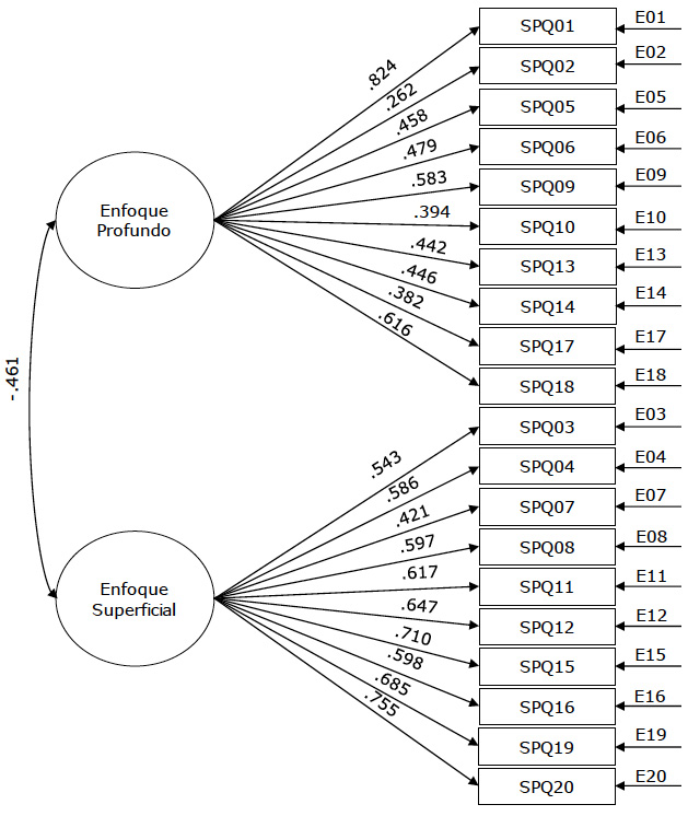 Revised Two Factor Study Process Questionnaire (R-SPQ-2F; Biggs et ál., 2001): Se aplicó la versión localmente adaptada a estudiantes universitarios (Freiberg-Hoffmann y Fernández-Liporace, 2016). El instrumento comprende 20 ítems que deben ser respondidos mediante una escala Likert de cinco opciones que van del total desacuerdo al total acuerdo. La herramienta evalúa dos enfoques de aprendizaje que son, el profundo (1, 2, 5, 6, 9, 10, 13, 14, 17, 18) y el superficial (3, 4, 7, 8, 11, 12, 15, 16, 19, 20). La adaptación local de la herramienta presenta evidencias de validez de contenido (ítems con coeficientes V superiores a 0.70), constructo mediante análisis factorial exploratorio (varianza común = 48.8 %) y confirmatorio (CFI = 0.931, RMSEA = 0.066, NFI = 0.908 y NNFI = 0.923), consistencia interna (α profundo = 0.76 y α superficial = 0.83), y confiabilidad test-retest (rprofundo = 0.74 y rsuperficial = 0.73). Adicionalmente se consultó a los participantes sobre el nivel educativo en curso, su edad y sexo.