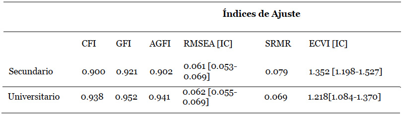 A continuación se analizó la estabilidad del modelo en muestras de estudiantes de nivel secundario y universitario por separado. Para esto se segmentó la muestra según nivel educativo y se efectuó un análisis de validación cruzada, que arrojó adecuados índices de ajuste para ambas muestras. Asimismo, la estabilidad del modelo también se verificó a partir de la lectura del índice ECVI, cuyo valor registrado para la muestra de estudiantes secundarios se encuentra dentro de los intervalos de confianza informados para la muestra de universitarios y viceversa. (Rial-Boubeta, Varela-Mallou, Abalo-Piñeiro y Lévy-Mangin, 2006) (tabla 2).