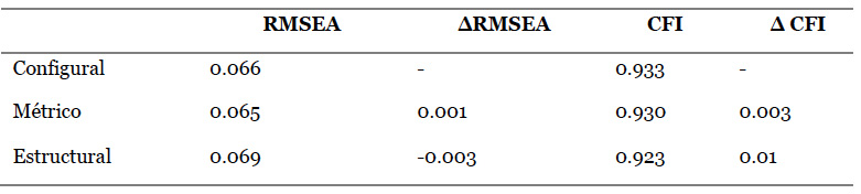 Por otra parte, se estudió la invarianza factorial del modelo. Para esto se comparó el modelo entre las muestras de estudiantes de nivel secundario y universitario aplicando distintos niveles de restricción. Se probó primero un modelo configural (sin restricciones), luego un modelo métrico (restringiendo las cargas factoriales de los ítems) y por último un modelo estructural (restringiendo las covarianzas). Los resultados verificaron la equivalencia factorial del modelo para las dos muestras analizadas, ya que los ΔRMSEA y Δ CFI alcanzaron valores iguales o inferiores a 0.015 y 0.01 respectivamente (Davidov, Schmidt, Billiet y Meuleman, 2018).