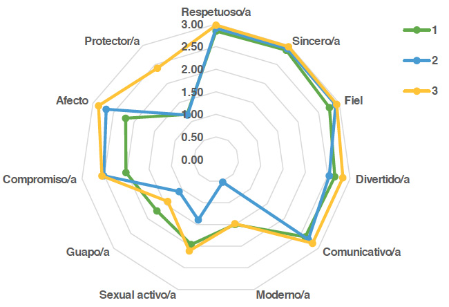 Cluster 2 o perfil tradicional: es un perfil que se caracteriza por valorar en menor medida la belleza, la modernidad, la actividad sexual, e incluso ligeramente menos la diversión. Al igual que el resto valora la sinceridad, el respeto, la fidelidad, la afectividad y la comunicación, pero se caracteriza por la importancia que otorga al compromiso.