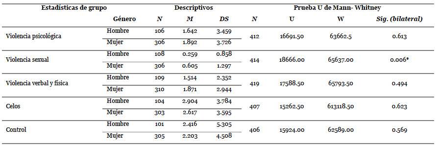 El análisis descriptivo de la violencia en la pareja adolescente sufrida muestra unas puntuaciones de violencia verbal y física, violencia psicológica, violencia sexual, celos y control que oscilan entre 0..3 y 2.9 (rango= 0-4). Por orden de frecuencia, las dimensiones de la violencia que más vivencian los sujetos son: los celos, seguidos del control, la violencia psicológica, después la dimensión de violencia verbal y física y, por último, la de tipo sexual. Los datos revelan en mujeres mayores cifras de victimización de la violencia psicológica (M = 1.982), verbal y física percibida (M = 1.871) y violencia sexual (M = 0.605), aunque en estas diferencias solo son atribuibles al género en la violencia sexual [U = 18666.00. p = 0.006]. En la victimización de celos y control ocurre lo contrario, es mayor el número de hombres que aseguran haber sufrido celos por parte de su pareja (M = 2.904) y control (M = 2.416), pero no son diferencias estadísticamente significativas.