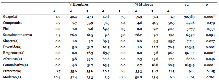 El análisis de los valores culturales asociados a la pareja tuvo como objetivo conocer qué cualidades o rasgos de sus parejas eran importantes para los adolescentes. Los rasgos más valorados por los jóvenes fueron el respeto, la fidelidad y la sinceridad, mientras que el menos valorado fue estar a la moda/ser moderno. Las pruebas de contraste según la variable género muestran que existen diferencias estadísticamente significativas entre hombres y mujeres en la valoración que estos hacen de la belleza, del respeto, la sinceridad, lo divertida que pueda ser la otra persona, lo afectuoso(a) y lo comunicativo(a) que la pareja sea. Las mujeres valoran más que la persona que eligen como pareja sea respetuosa(o) (χ2 = 19.444, p = 0.000), comunicativa(a) (χ2 = 16.549, p = .000) sincera (χ2 = 7.214, p = 0.027) y afectuosa (χ2 = 6.160, p = 0.046), mientras que la belleza, es un rasgo más valorado en sus parejas por los hombres (χ2 = 30.383, p = 0.000). La valoración de que sus parejas sean divertidas es otro de los valores donde mujeres y hombres muestran diferencias estadísticamente significativas (χ2 = 12.343, p = 0.002). Para los hombres, la valoración que hacen de este rasgo en sus parejas se distribuye a lo largo del gradiente, encontrando que para el 5.8 % de ellos es poco importante encontrar este rasgo en sus parejas, bastante importante para el 31.7 % y, por último, el 62.5 % de ellos valoran como muy importante que sus parejas sean divertidas. Por su parte, las mujeres concentran la valoración de la diversión como muy importante (76.3 %) y bastante importante (22.7 %) encontrando que solo un 1 % de las mujeres valoran como poco importante la diversión en sus parejas.