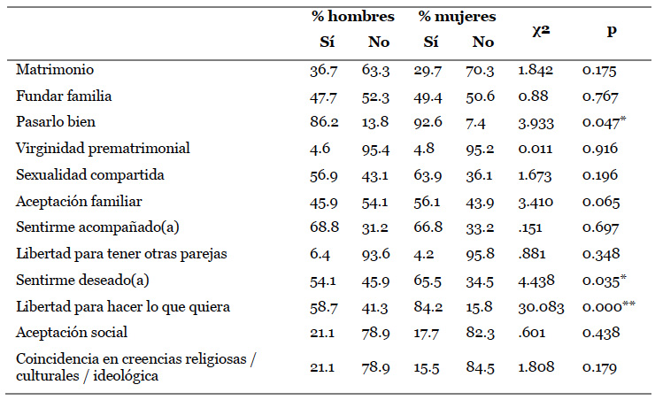 Además de los valores asociados a la pareja como individuo se analizaron los valores asociados a la relación de pareja en su dimensión de vínculo. Las cualidades valoradas en la pareja, por orden de mayor a menor importancia fueron: pasarlo bien, libertad para hacer lo que quiera, sentirme acompañado(a), sentirme deseado(a), mantener una sexualidad compartida, aceptación familiar, fundar una familia, matrimonio, aceptación social, coincidencia en creencias religiosas/culturales/ideológica, libertad para tener otras parejas y, por último, virginidad prematrimonial. De entre todos los valores analizados, se identificaron diferencias significativas atribuibles al género en tres aspectos. Por un lado, en la importancia que ambos géneros coincidían a la libertad para hacer lo que quiera dentro de la relación de pareja (χ2 = 30.083, p = 0.000), aspecto señalado como relevante por un 84.2 % de mujeres frente a un 58.7 % de los hombres. El segundo tiene que ver con sentirse deseado(a) (χ2 = 4.4.38, p = 0.035), al cual un 65.6 % de mujeres contesta afirmativamente frente a un 54.1 % de los hombres. El último rasgo cultural fue la importancia de pasarlo bien (χ2 = 3.933, p = 0.047), en el que el 92.6 % de las mujeres priorizaron este valor frente al 86.2 % de los hombres.