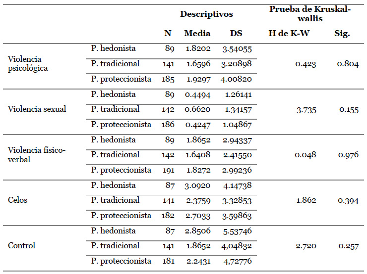 Por último, para establecer si existen diferencias en la violencia sufrida atribuidas a los perfiles culturales asociados a la pareja (perfil hedonista desapegado, tradicional o proteccionista), se realizó la prueba estadística de Kruskal Wallis.