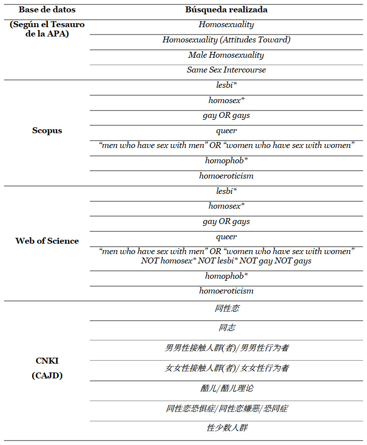 La búsqueda se realizó de forma sistemática en 6 bases de datos: BVS (Biblioteca Virtual de la Salud), Dialnet, PsycINFO (PsycNET), Scopus y Web of Science con el acceso de la Universidad Autónoma de Barcelona y CNKI (China National Knowledge Infrastructure, 中国知网) con el acceso de la Universidad Renmin de China (中国人民大学). La búsqueda de las primeras 5 bases de datos fue realizada y completada entre junio y octubre del año 2017, y la de CNKI, el noviembre del mismo año. Puesto que unas bases de datos tienen un sistema de descriptor y tesauro y otras no, hubo que adaptar las palabras de búsqueda para cada caso como se muestra en la tabla 1. En el caso de CNKI, hemos usado su área de artículos: CAJD (China Academic Journal Network Publishing Database, 中国期刊全文数据库). Debido a la diferencia gráfica, lingüística, gramática y semántica entre el chino y el español, aquí presentamos las expresiones equivalentes para la búsqueda: 同性恋: Homosexual, homosexuales, homosexualidad, lesbiana, lesbianas, lesbianismo, gay, gays; 同志1: gay, gays, lesbiana, lesbianas; 男男性接触人群(者)/男男性行为者: hombre(s) que tiene(n) sexo con hombre(s); 女女性接触人群(者)/女女性行为者: mujer(es) que tiene(n) sexo con mujer(es); 酷儿/酷儿理论: queer/ teoría queer; 同性恋恐惧症/同性恋嫌恶/恐同症: homofobia; 性少数人群: minoría sexual.