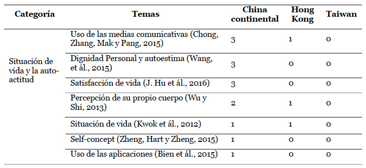 Además, debe mencionarse que, dentro de la literatura identificada hay 9 trabajos (7 de la China continental, 1 de Hong Kong y 1 de Taiwan) que se focalizan específicamente en la población femenina; 5 estudios (todos de la China continental) son explícitamente comparativos entre la población homosexual y la heterosexual. También hay que señalar que de la China continental se hallan 2 revisiones de literatura: una de ellas, publicada en el 2013, es una revisión de estudios sobre homosexualidad en la Psicología de China y ha analizado los artículos, tesis y compendios de artículos y otra es una revisión de la literatura extranjera sobre la “body image” de la población lésbica, la cual ha revisado el contenido, la metodología y las teorías de los trabajos sobre este tema de otros países.