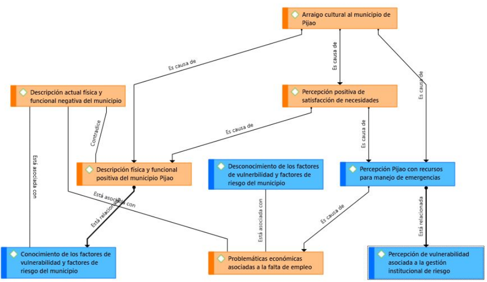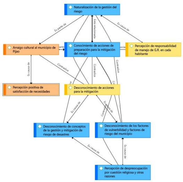Por otra parte, el modelo emergente consideró los elementos que puedan imposibilitar la naturalización del concepto de gestión de riesgo. Así, se encontró que la despreocupación general y desmotivación por las acciones de mitigación pueden dificultar el trabajo con la comunidad con el fin de propender por la adopción de las prácticas de gestión de riesgo. Tales actitudes pueden estar mediadas por la indiferencia hacia estos temas, en parte generada por algunos factores como la religión: algunos habitantes de diferentes sectores mostraron cierta despreocupación por aprender sobre gestión del riesgo en tanto manifestaron que es algo frente a lo que no pueden actuar. Expresiones como: “eso solo lo sabe Dios”, “cuando Dios actúa no hay nada que hacer” enmarcan la falta de motivación por generar prácticas de mitigación. Igualmente, se entiende que el reconocimiento tanto del riesgo, como de las acciones mitigadoras, entorpecen también la naturalización del concepto de gestión de riesgo. Esto puede deberse a dificultades en la planeación por parte de los entes competentes en proyectar la información necesaria, así como la poca adhesión de los habitantes por estos espacios de socialización.