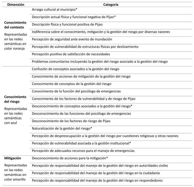 Para llevar a cabo la extracción de información, se realizaron entrevistas semi-estructuradas. Los investigadores delimitaron tres temáticas para la elaboración de las preguntas: conocimiento del contexto, conocimiento del riesgo y acciones para la mitigación del riesgo de desastres. Con esto se procedió a la elaboración y prueba piloto de la entrevista (Anexo 1). La categorización se realizó en dos partes: cada investigador propuso categorías a partir de la lectura y codificación de las entrevistas. A continuación, durante la codificación axial, se procedió a la verificación y anulación de dichas categorías para pasar al último grupo de categorías en las que se suman las categorías emergentes compiladas en la tabla 1.