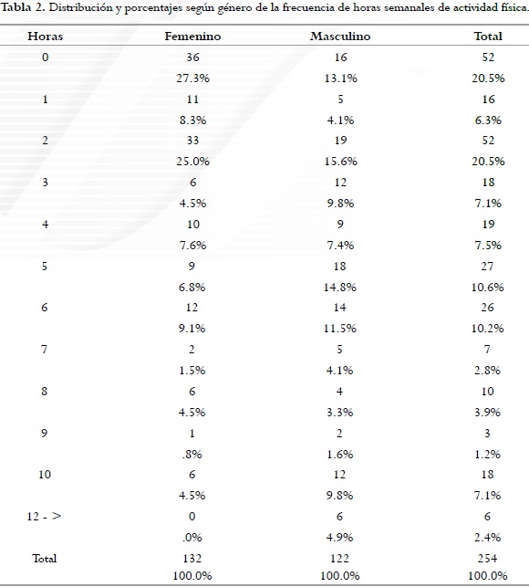 En la tabla 2 se exhibe la distribución según el número de horas de AF semanales que los adolescentes reportaron en la última semana (Md=3.74, Dt=3.23), como se puede notar el 20.5% no realiza actividad.