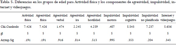 En la tabla 3 se puede apreciar que la puntuación de los hombres es mayor en actividad física, agresividad física, agresividad verbal, impulsividad motora, impulsividad cognitiva e internet y videojuegos. Las mujeres por su parte puntúan más alto en ira y hostilidad.