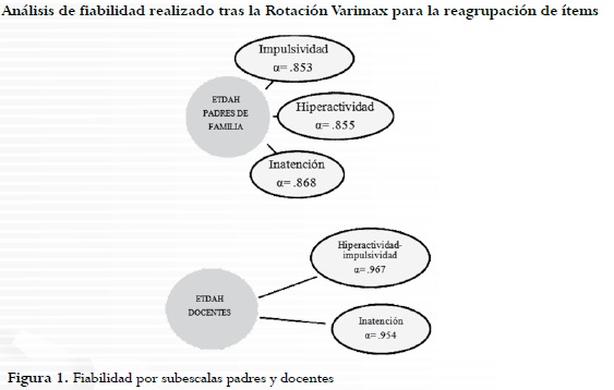 Con el nuevo modelo propuesto para la ETDAH luego de la rotación Varimax para padres de familia a partir del análisis factorial, se realizó análisis de confiabilidad donde se observó que aumentó el Alfa de Cronbach en cada una de las variables; impulsividad pasa de un α= .835 a un α= .853; hiperactividad pasa de un α= .852 a un α= .855 e inatención pasa de un α= .863 a un α= .868.