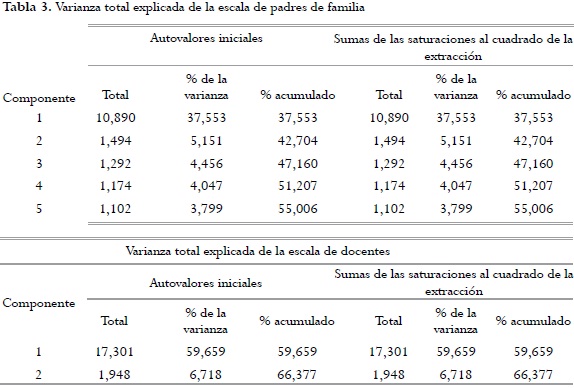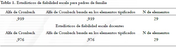 En la tabla 1 se presenta el análisis de confiabilidad por medio del coeficiente Alfa de Cronbach con un de α= .939 para padres y un α= .976 para docentes. Se observa que estas escalas poseen una excelente consistencia interna, es decir son consistentes en las respuestas de los ítems; evidenciando la homogeneidad de las respuestas, lo que va a garantizar la estabilidad de las mismas en varias aplicaciones al mismo sujeto.