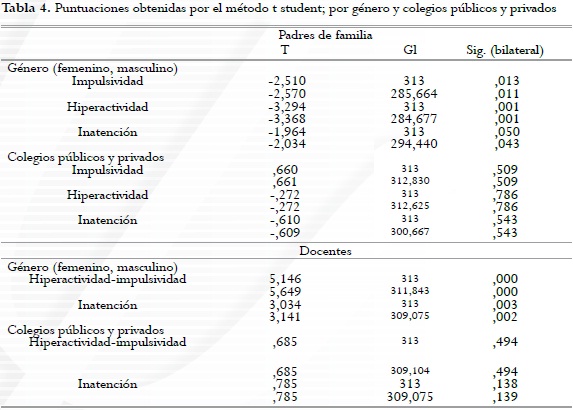 En la tabla 4 se muestra en análisis de varianza en las tres dimensiones (Hiperactividad, impulsividad e inatención) teniendo en cuenta el género y los colegios públicos y privados. En la escala para padres de familia y docentes, en cuanto al género existe diferencia significativa; mientras por colegios no existe diferencia estadísticamente significativa.