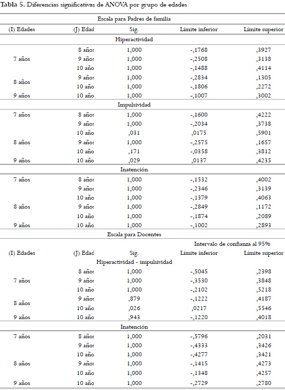 Las comparaciones de edades se hicieron con la prueba ANOVA de un factor utilizando la corrección de Bonferroni donde se encontraron diferencias significativas en la variable de impulsividad entre los grupos de edades de 7 y 10 años, y 9 y 10 años en la escala para padres de familia; y en la variable hiperactividad - impulsividad en las edades de 8 y 10 años en la escala de docentes. En las demás variables comparadas con los grupos de edades no se encontraron diferencias significativas. Según el DSM-.IV-TR, en la mayoría de los casos, el trastorno se mantiene relativamente estable a lo largo de los primeros años de la adolescencia, lo que explica no encontrar diferencias significativas en las variables mencionadas.