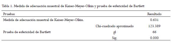 En la tabla 1, se ve como la prueba KMO muestra un resultado de 0.6 y la prueba de esfericidad de Bartlett arroja una X2 alta (123,4) con un p-valor menor de 0.05 (sig.= 0.000), que indica que se puede realizar un análisis factorial con los datos (ver Tabla 1).