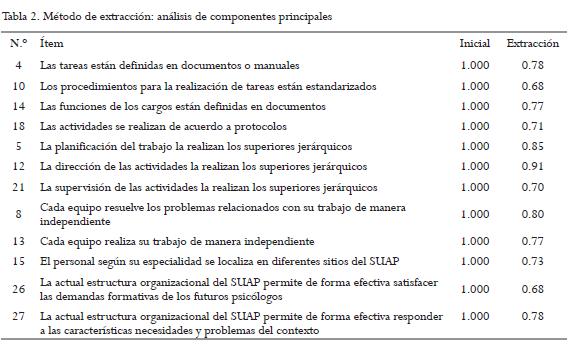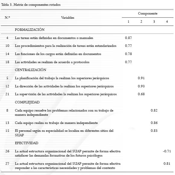 En el primer factor se agrupan cuatro variables, que de acuerdo con la escala, se concluye que indagan por la formalización, en el segundo factor tres variables que dan cuenta de la centralización, en el tercer factor tres variables que informan acerca de la complejidad y en el último factor se integran dos preguntas que explican la efectividad del SUAP. En la tabla 3 se exponen los factores latentes y las variables observables obtenidas en cada componente.