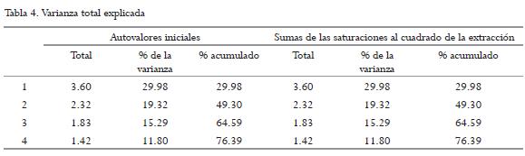 El resultado así obtenido, indica que los cuatro factores explican un 76.39% de la variabilidad de los datos como se ilustra en la tabla 4, lo que es aceptable y da garantía de la validez para el análisis.
