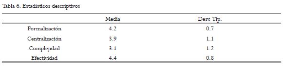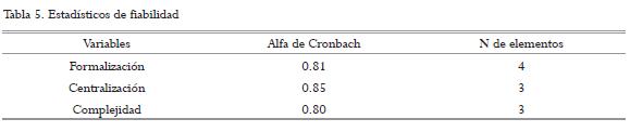 Al constructo de variables independientes obtenido (formalización, centralización y complejidad) se le aplicó un análisis de fiabilidad con el Alfa de Cronbach, obteniéndose un resultado mayor a 0.8 en todos los factores latentes, lo que indica una buena consistencia interna. A la variable dependiente no se le aplicó este análisis dado que sólo se definió un ítem por cada dimensión de efectividad (docencia y extensión). Los resultados se aprecian en la tabla 5.