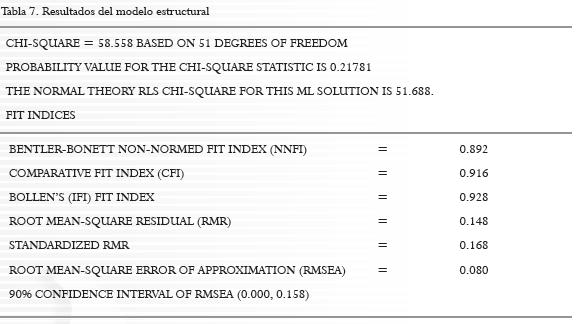 Paso siguiente se comprobó que el «t-value» de los parámetros fuera diferente de cero. En todos los casos esto se corroboró con valores entre 1.0 y 4.6. Igualmente se verificó que la varianza de los errores de las variables observables y de los factores latentes fuera diferente de cero. Con excepción de la variable 6, todos fueron significativos. En la tabla 7 se muestran los resultados de ajuste del modelo estructural en el formato de salida producido por el software EQS.
