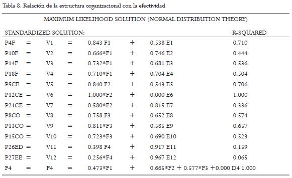 En general, todo el modelo presenta cargas factoriales que determinan una influencia apropiada de las variables observables sobre los factores latentes, por lo que se concluye que son explicativos de las características estructurales de los SUAP. Se exceptúa de manera manifiesta las variables asociadas a la efectividad, lo que dicta que ésta se ve explicada por una serie de condiciones diversas que se recogen en el error de medida. Esto sugiere que la escala asumida para medirla no fue la más adecuada. A pesar de ello, la incidencia de los factores exógenos (variables independientes) sobre el factor endógeno (variable dependiente), muestra unos pesos relativos aceptables, circunstancia que indica que la formalización (0.50), la centralización (0.7) y la complejidad (0.6), influyen positivamente sobre la efectividad.