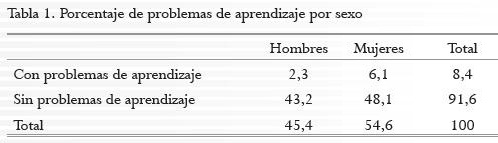 En cuanto al sexo y su relación con los diagnósticos más frecuentes de la muestra de 621 usuarios, en la tabla 1 se evidencia que la diferencia entre hombres y mujeres es significativa con respecto a los problemas de aprendizaje en la muestra total, siendo el 6,1% para el sexo femenino, mientras que en el masculino hubo un 2,3%.