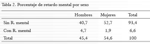 En la tabla 2 se evidencia que la diferencia entre hombres y mujeres es significativa con respecto al retardo mental, siendo el 1,9% para el sexo femenino, mientras que en el masculino hubo un 4,7%.