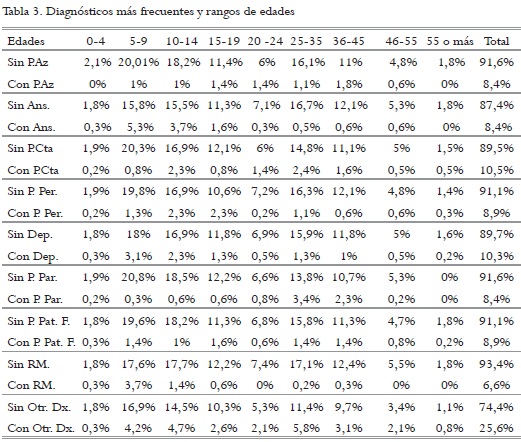Como se puede apreciar en la tabla 3, en cuanto a los grupos de edades y su relación con los diagnósticos más frecuentes, se evidencian diferencias significativas entre rangos de edades y problemas de aprendizaje, ansiedad, problemas de conducta, problemas de ajuste de personalidad, depresión, problemas de pareja, problemas paterno filiales, retardo mental y otros diagnósticos.