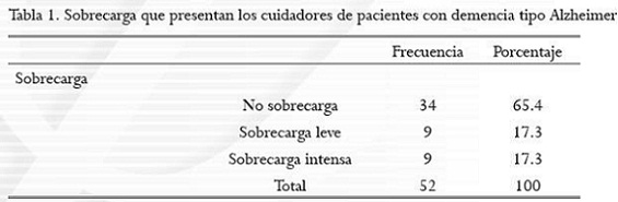 This study's objective was to determine the overload levels of caretakers for patients with Alzheimer dementia. The sample was selected by convenience. The main task had to be the care and support of a relative with this disease. 52 caretakers were evaluated, without regard of age, gender, race or religion. The overload evaluation was done using the Overload Scale of Caretaker Zarit Test, which seeks to identify the level of overload. Social demographic data was simultaneously organised and analysed using the SPSS version 1.9 statistics program. Results show that 65.4% did not file overload, 17.3% presents mild overload and the same percentage presents severe overload. It was determined that social demographic data such as highly educated, high socioeconomic status and relationship are related to the overload.