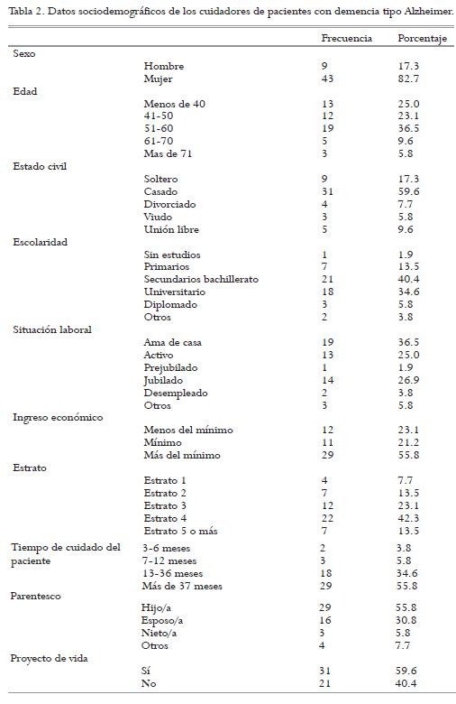 En el análisis de resultados se encontró que el nivel de sobrecarga presentado en los cuidadores es bajo (65.4%), no presentando sobrecarga, con una media de 1.52 (ver tabla 1). La mayoría de los cuidadores de los pacientes con enfermedad de Alzheimer, son mujeres (82.7%) con edades entre 51 a 60 años (36.5%), que están casadas (59.6%) y son amas de casa (36.5%), pero que tienen ingresos económicos superiores al salario mínimo legal vigente (porcentaje 55.8%, media 2.33), además también se encontró que son las hijas las que cuidan a sus padres con un 55.8% y que solamente tienen estudios secundarios (40.4%). También se observó que el estrato económico en donde viven es de estrato 4 (42.3%) (ver tabla 2).