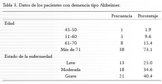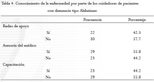 El tiempo de cuidado que han llevado con el paciente corresponde a un periodo superior de los 37 meses (55.8%) y la edad promedio del paciente es superior a los 71 años (73.1%), los cuales se encuentran en una etapa grave de su enfermedad con un 40.4% (ver tabla 2 y 3). Se pudo encontrar que los cuidadores no han tenido ninguna red de apoyo (57.7%) ni han recibido capacitación sobre el cuidado de las personas con enfermedad de Alzheimer (55.8%), pero demostraron sí haber recibido asesoría por parte del médico en cuanto a la enfermedad (55.8%). También se encontró que aún tienen un proyecto de vida (59.6%) (ver tabla 4).