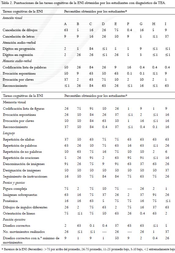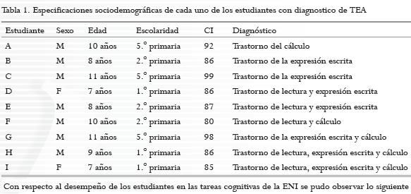 Posterior a esta selección, la muestra quedó conformada por 11 estudiantes, a los cuales se les aplicaron las tareas de habilidades escolares de la ENI, descartándose 2 estudiantes que no evidenciaron fallas suficientes en las tareas de lectura, escritura y/o cálculo, para diagnosticar un TEA. Finalmente, la muestra de la presente investigación quedó conformada por nueve estudiantes que cumplieron con todos los criterios diagnósticos de TEA según el DSM-IV-TR, a los cuales, se les aplicaron las tareas de habilidades cognitivas de la ENI.