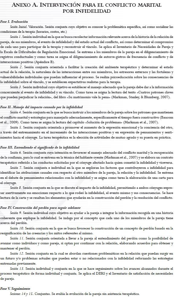 Ya en lo que se refiere a la intervención para el conflicto marital por infidelidad, Baucom et al. (2009) presentan un modelo de tratamiento de tres etapas y distinguen para cada una componentes terapéuticos específicos: