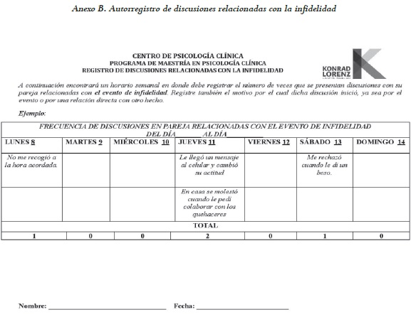 Autorregistro de frecuencia de discusiones. Instrumento que determina la frecuencia de discusiones relacionadas con la infidelidad. Aplicado semanalmente.