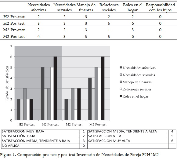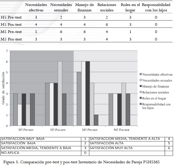En la figura 1 se observa que en el pre-test la satisfacción percibida por los miembros de la P2 en el área de necesidades afectivas y necesidades sexuales era baja; en el manejo de las finanzas hay una satisfacción media tendiente a baja; las relaciones sociales y los roles en el hogar presentan un bajo nivel de satisfacción. En el pos-test, ambos miembros de la pareja coincidieron en calificar como altamente satisfechas sus necesidades en cuanto a roles en el hogar, y demostraron satisfacción alta en las áreas necesidades sociales y necesidades afectivas.