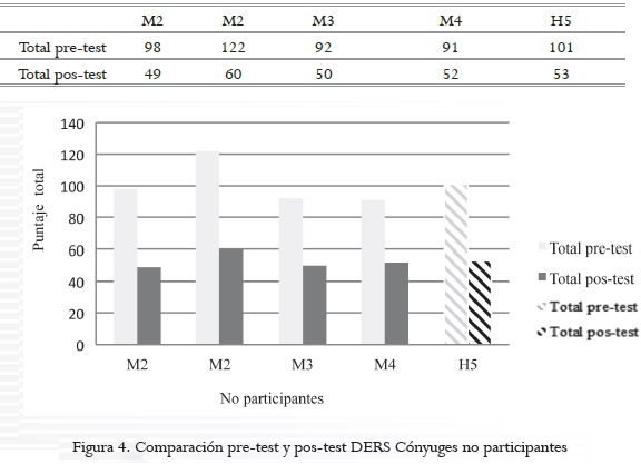 Pasando a los resultados de la Escala de Dificultades de Regulación Emocional (ders) de Gratz y Roemer (2004), en el pre-test, los cónyuges no participantes presentaron desregulación emocional, lo cual se manifestaba en comportamientos erráticos y desbordados. Los resultados demuestran que los procesos que permiten el monitoreo, la evaluación y la modificación de las reacciones emocionales, que Zeman et al. (2006) refieren como esenciales para la regulación emocional, se vieron alterados en estas personas a causa del evento de infidelidad.