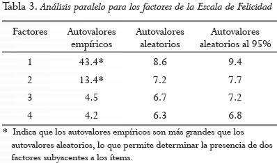 Toribio, González, Valdez, González y Van Barneveld (2012), buscaron, en una muestra de 405 estudiantes de preparatoria, mujeres y hombres, de 14 a 19 años, obtener indicadores de validez de la Escala de Felicidad de Alarcón. A través de un análisis factorial exploratorio, mediante el método de componentes principales y rotación ortogonal de tipo Varimax, se obtuvieron cuatro factores (sentido positivo de la vida, satisfacción con la vida, realización personal y alegría de vivir) que explicaron el 50.32% de varianza total.