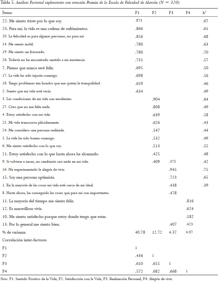 Luego de la determinación de factores, se procedió a la rotación mediante el método Promin, una forma de rotación oblicua que maximiza la simplicidad factorial (Lorenzo Seva, 1999). Los dos factores explicaban el 61.19% de la varianza total de la prueba. El primer factor explica el mayor porcentaje de varianza (40.781%), el segundo el 12.724%, el tercero 4.368% y el cuarto 4.073% (ver Tabla 4).En la tabla 5, se aprecia los cuatro factores y sus respectivos ítems. Así, el Factor I ("Sentido positivo de la vida") se compone de los ítems: 2, 7, 14, 17, 18, 19, 20, 22, 23, 26, factor II ("Sentido Positivo de la Vida") de los ítems 3, 4, 5, 6, 21, 24, 25, 27; el factor III ("Realización personal") compuesto por los ítems 1, 8, 9, 15, 16; y el factor IV ("Alegría de Vivir") por los ítems 10, 11, 12, 13. Si bien algunos ítems cargan en dos factores al mismo tiempo como el caso del ítem 9 y 13, se utiliza el criterio teórico para establecer su pertenencia a un factor. Por último, esta tabla evidencia que la correlación entre los factores es moderada (.577), lo que confirma el uso de la rotación oblicua Promin (Lorenzo- Seva, 1999).
