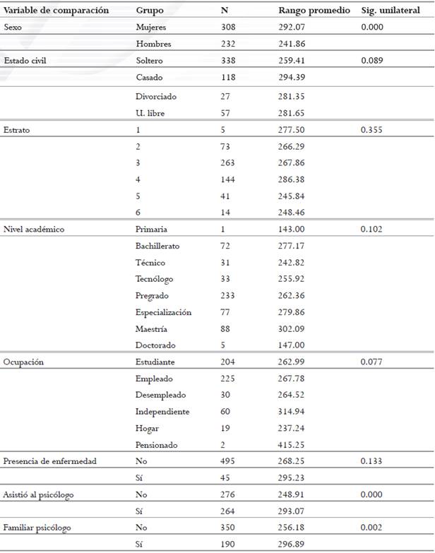 Para determinar si la edad presentaba alguna correlación con la puntuación en la actitud hacia el psicólogo, se llevó a cabo una correlación de Spearman, encontrándose un coeficiente de 0.107, lo que permite afirmar que hay una débil correlación entre estas dos variables. A continuación, se muestran las comparaciones de las actitudes con las distintas variables (Tabla 2).