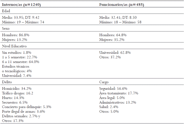 El diseño es de tipo descriptivo, correlacional y transversal, debido a que se calculan las frecuencias de palabras asociadas a un término inductor y se estudian las asociaciones entre el corpus de palabras y variables de estatus y tipo de delito, en una única recolección de datos por sujeto. La muestra fue de 485 trabajadores penitenciarios y 1240 personas condenadas, quienes respondieron al instrumento en el año 2011, en el marco de un proyecto sobre estrategias y procedimientos de tratamiento penitenciario en Colombia. Las muestras fueron por conveniencia, ya que la participación tanto de personas privadas de la libertad como de funcionarios/as era voluntaria, además procedían distribuidas en 11 establecimientos penales a cargo del Instituto Nacional Penitenciario y Carcelario de Colombia (INPEC). Estos centros fueron el de Ibagué (7.8%), La Dorada (8.2%), Cómbita (9.2%), Reclusión de Mujeres de Bogotá (7.2%), el de Cúcuta (8.2%), Penitenciaría de Bogotá (6.2%, hombres), de Jamundí (8.9%), Barranquilla (7.1%), Bellavista (7.1%), Pedregal Hombres (4.3%), Pedregal Mujeres (5.3%), Girón (6.5%), Acacías (8.3%), Popayán (5.3%) y Rioacha (0.3%); cubriendo de esta manera las seis regiones o áreas del país en las que el INPEC agrupa administrativamente los centros a su cargo. En la Tabla 1 se presentan las principales características de la muestra.