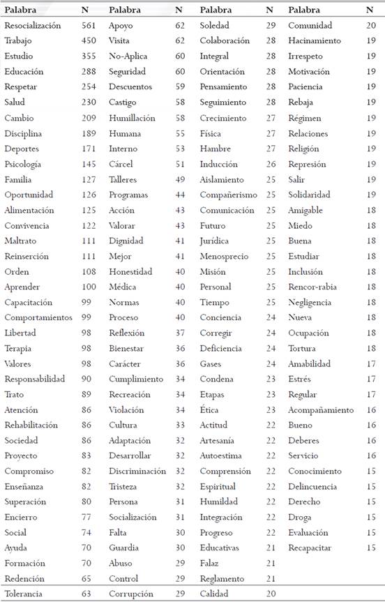 La Tabla 2 presenta resultados de los análisis de frecuencias de las palabras que los sujetos encuestados escribieron con relación al término inductor «Tratamiento Penitenciario». Según su orden de frecuencia se puede apreciar que el tratamiento penitenciario se asocia principalmente con el concepto de resocialización y con las actividades/áreas básicas de dicho tratamiento: los programas de estudio, trabajo y educación.