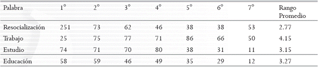 Teniendo en cuenta que los sujetos debían escribir hasta siete palabras relacionadas con el tratamiento penitenciario, se calculó el rango de aparición de las cuatro palabras más frecuentes. Para ello se obtuvo la frecuencia de estos vocablos en cada orden posible de aparición, dando como resultado los rangos promedios de cada uno de ellos, los cuales se muestran en la Tabla 3. Hay que recordar que el rango promedio es otro de los criterios de saliencia para identificar los elementos de la RRSS, constitutivos del nodo central (Vergés, 1994), de acuerdo con la premisa de que los primeros términos que surgen espontáneamente en una tarea de asociación libre de palabras son más centrales. Según ello, se puede apreciar en la Tabla 3 que los términos «resocialización», «estudio» y «educación» tienen un rango promedio por debajo del rango medio teórico (4), y que la distribución de frecuencias se concentra en los primeros lugares -a menor rango, la palabra es escrita en los primeros lugares, lo que es indicador de su mayor centralidad con relación a las palabras escritas en últimos puestos.