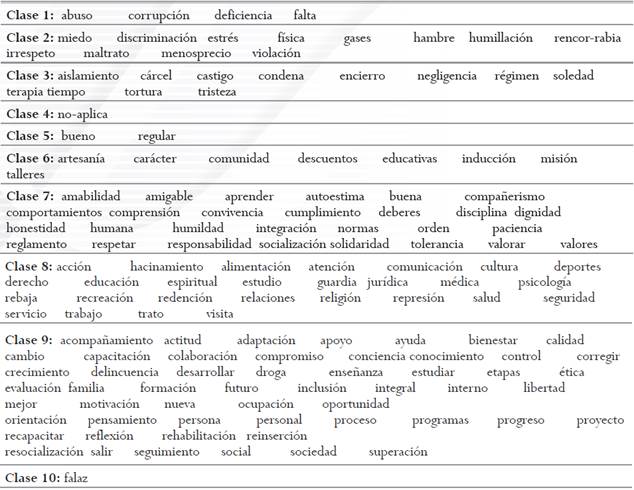 No sorprende, por ello, que el núcleo central de la representación social del tratamiento penitenciario esté conformado por tres elementos expuestos en la norma: la resocialización como proceso para vivir en libertad y el estudio y la educación como acciones concretas que permiten el desarrollo por parte de las personas condenadas. Así, el nodo central «resocialización-trabajo-estudio-educación» organiza el resto de la representación social (Abric, 1993), agrupando sus contenidos en una serie de campos semánticos, por medio de aquellos principios organizadores que postularon Doise y colaboradores (1992), y que permiten hacer compatible la existencia de ese nodo central, compartido por la mayoría de las personas que se encuentran en prisión, con discursos o visiones particulares de los grupos involucrados en la vida y la organización de las prisiones. Por un lado, estos contenidos son tanto actitudes, ejemplos, acciones, emociones, adjetivos, verbos y sustantivos, en la línea de lo predicado por Páez (1987); por otro, tales contenidos dan lugar a unos agrupamientos cuyo contenido permite revelar las dimensiones subyacentes al tratamiento penitenciario: a) deficiencias por corrupción, b) formas de maltrato, c) punición, d) negación de la existencia de tratamiento penitenciario, e) valoración positiva o regular, f) talleres específicos, g) valores en torno a un trato digno, g) áreas disciplinares y acciones, h) apoyo y resocialización, e i) el tratamiento como una utopía engañosa, una falacia. Los individuos van a estar más próximos a una u otra dimensión en función del status que ocupan en esta institución total que es la prisión y de necesidades específicas cuyo origen está, no pocas veces, fuera de la institución. Así, cada grupo va a prestar atención a seleccionar y asimilar las informaciones que son congruentes con esas posiciones, y, también, a ignorar otras informaciones, como lo revela el método de las especificidades en cuanto a las palabras o discursos que «no se dicen» al interior de cada grupo. Así, un grupo puede caracterizarse, en su anclaje de la representación social del tratamiento penitenciario, tanto por lo que se dice o expresa como por el silencio activo frente a otros elementos de la representación social que atentan de alguna manera a su estatus, creencias o informaciones previas y/o comportamientos.
