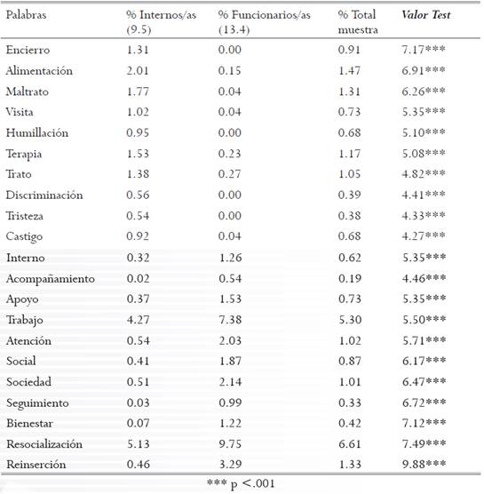 Posteriormente, se calculó la frecuencia de cada palabra, su rango medio -orden promedio de aparición de las palabras más frecuentes-, los campos o principios organizadores de la representación social mediante la clasificación jerárquica de palabras, y el anclaje de las representaciones sociales del tratamiento penitenciario por rol (funcionarios vs. Internos), por tipo de trabajo entre los funcionarios y por tipo de delito entre los reclusos/as mediante el método de especificidades (Etxeberría, García, Gil, & Rodríguez, 1998). El algoritmo calcula si una palabra es empleada más o menos por un subgrupo que por el conjunto de la muestra, arrojando un estadístico, es decir, el valor test que indica el grado de significatividad de la diferencia de proporciones de empleo (o de no empleo) de una palabra, por parte de un subgrupo, con relación al conjunto de la muestra. Para los fines de este trabajo se retuvieron los resultados con valor test superior a 2,5, ya que valores menores pueden ser significativos pero influidos por la diferencia de tamaño entre los subgrupos de la muestra total (Etxeberría et al., 1998).